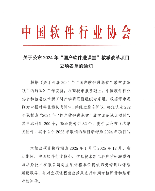 本次活动在高校申报基础上,中国软件行业协会和信息技术新工科产学研联盟组织专家组,根据评审规则对申报材料现场认真评审,并经过综合评议,决定认定282个课程为“2024年‘国产软件进课堂'教学改革试点项目”,其中本科组200个,高职高专组82个。