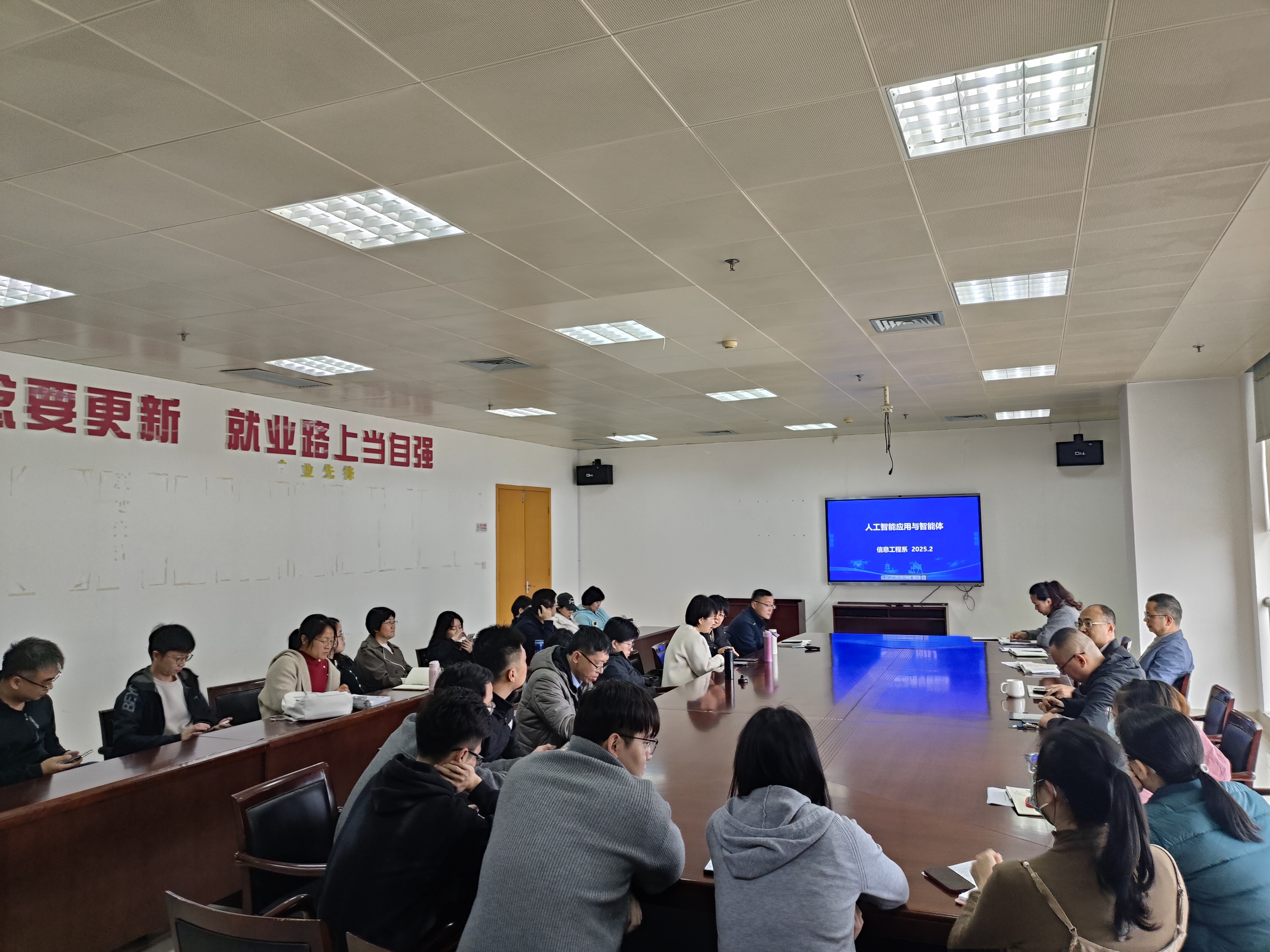 2月19日下午,信息工程系在景祺楼15楼会议室召开全系教职工大会,围绕"人工智能课程建设"及"导师制AI助手方案"两大主题展开深入研讨。系主任魏德志、系书记李达瑞、系副主任武斌出席会议,全系教职工参会。