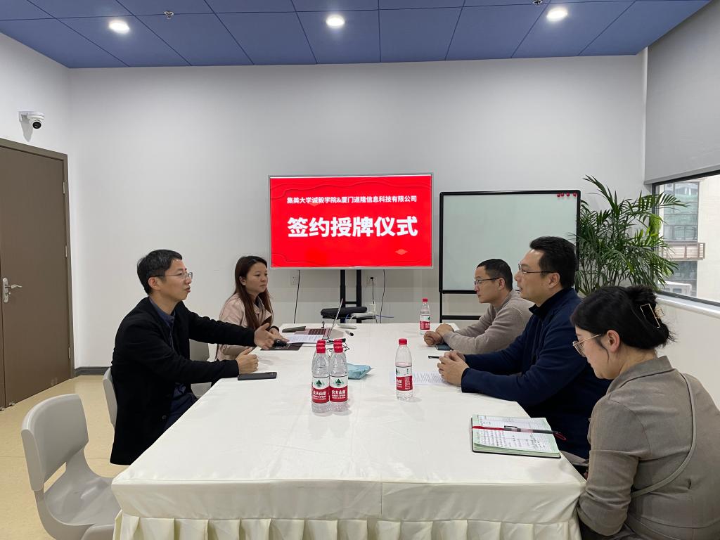 3月30日,信息工程系走访厦门道隆信息技术有限公司,与公司创始人&CEO朱竣峰、人资经理陈旖等就实训、就业等事项进行交流,并举行签约仪式,共建就业创业实习基地。信息工程系办公室主任薛小建、计算机基础教研室主任林幼平等参加此次活动。