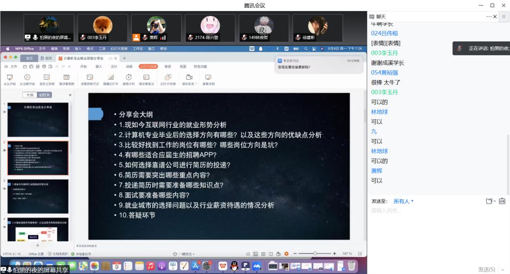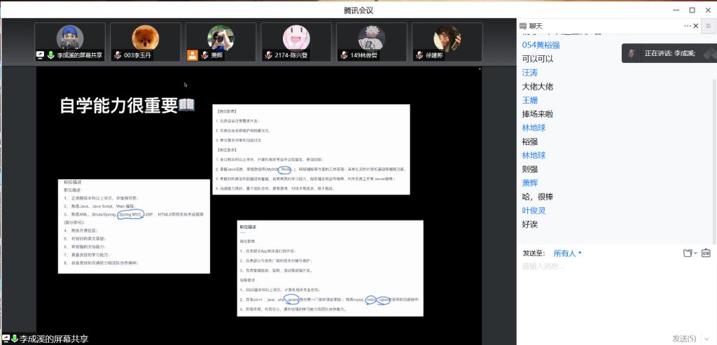 会上,李成溪根据自己的求职经历,从岗位信息获取、简历制作技巧、软件编程岗位基本特点等方面分享了自己的经验;吴健强以当前的就业形式为引导,对就业方向的选择、就业城市的选择及企业特点分析、行业薪资待遇、面试技巧等方面做了经验分享。