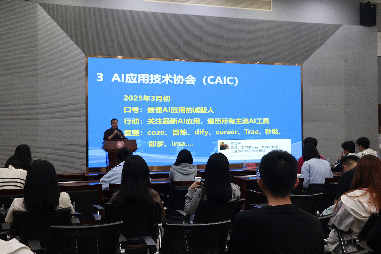 会上,CAIC协会学生谢乐桐、林世锦以“记账小助手”、“图片生成助手”与“PPT生成助手”等智能体为例,系统介绍智能体创建流程及工作原理,强调明确应用场景与数据集成对精准性的提升,阐释模块化组件串联如何降低开发门槛、提升执行效率。CAIC协会指导老师林幼平梳理了2022年底ChatGPT在社交媒体上走红之后国产AI应用技术(包括但不限于百度文心、讯飞星火、通义千问、Deepseek、Trae、Coze、百炼)发展脉络,指出行业对创新人才的需求激增,建议学生以实践深化理论认知,利用校、地、企为培养创新人才提供的良好平台,投身技术浪潮。同时,活动设置互动答题环节,师生踊跃参与,现场氛围热烈。