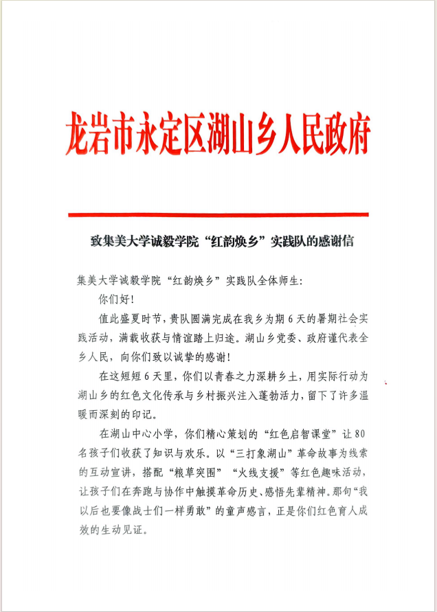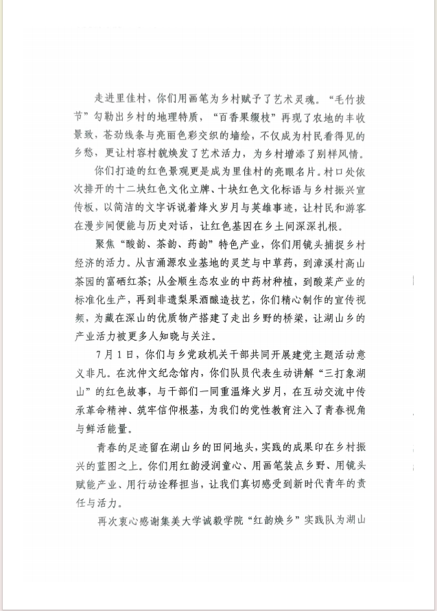 为传承红色基因、激活乡村发展动能,2025年6月26日至7月1日,集美大学诚毅学院信息工程系“红韵焕乡”实践队响应学院“青春为中国式现代化挺膺担当”暑期社会实践号召,深入龙岩市永定区湖山乡开展为期6天的社会实践活动。实践队员们通过红色文化传播、乡村艺术创作、特色产业调研等多样形式,在实践中感悟初心使命,为当地发展注入青春力量。此次实践活动成效显著,受到当地村民与学校的广泛认可,相关事迹被地方媒体关注报道。